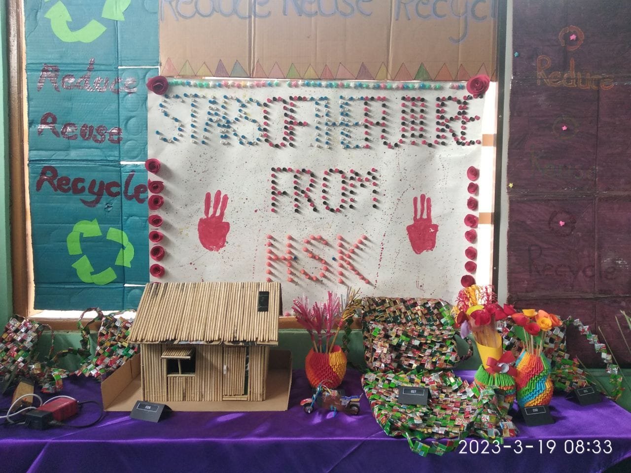 အခုနှစ်မတ်လ (၁၈)ရက်ကကျရောက်ခဲ့တဲ့ Global Recycling Day မှာ မြိုင်မြို့နယ် ပညာရေးဘုတ်အဖွဲ့ နဲ့ချိတ် ဆက်ဖွင့်လှစ်ထားတဲ့ ပြည်သူ့အခြေပြုကျောင်းပညာရေးဇုန်တခုက ကျောင်းသူ၊ကျောင်းသားတွေက စွန့်ပစ် ပစ္စည်း တွေကို လက်မှုအနုလက်ရာတွေအဖြစ် ပြန်လည်ဖန်တီးခဲ့ကြတာပါ။