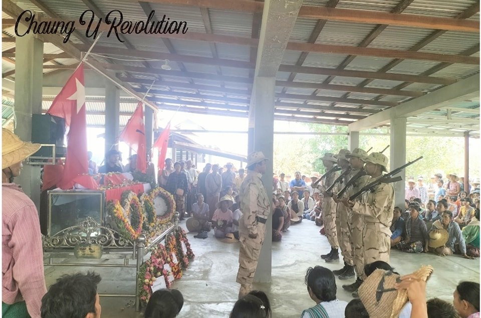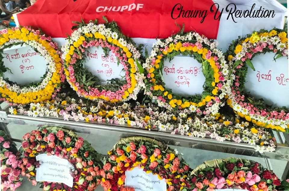 စစ်ကိုင်းတိုင်း၊ချောင်းဦးမြို့နယ် ကျီကုန်းကျေးရွာကို အခုလ ၅ရက်က စစ်ကောင်စီ စစ်ကြောင်းထိုးချိန်မှာ ထိပ် တိုက်တွေ့ပြီး နှစ်ဘက် ပစ်ခတ်မှုဖြစ်ရာက ကျဆုံးသွားတဲ့ တပ်ဖွဲ့ဝင်တွေရဲ့ ဈာပနကို ဒီကနေ့ ပြုလုပ်ခဲ့တဲ့ မြင် ကွင်းတွေဖြစ်ပါတယ်။