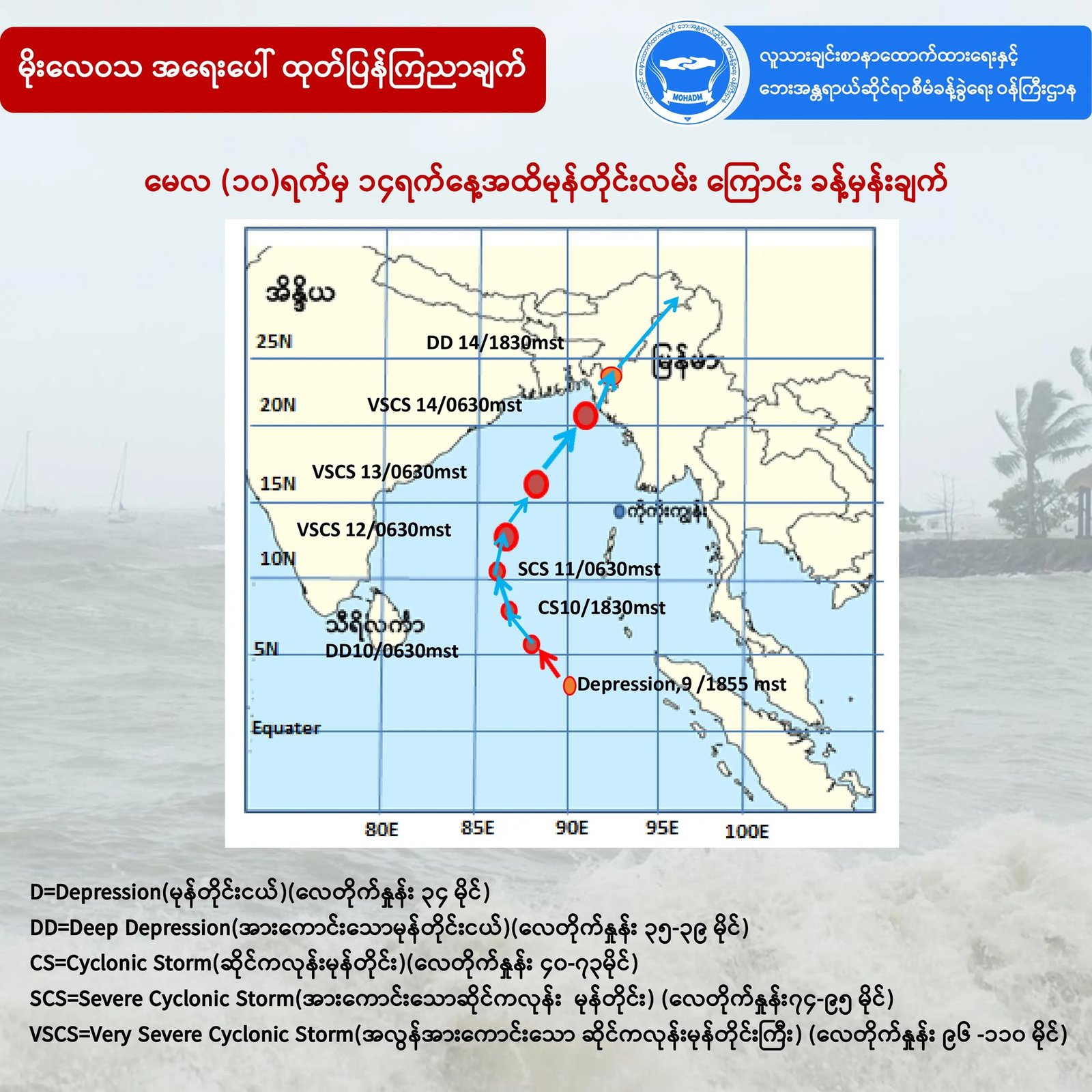 အဲ့ဒီအားကောင်းသော မုန်တိုင်းငယ်ဟာ ဒီကနေ့ညပိုင်းမှာ မိုချာ လို့အမည်ပေးနိုင်တဲ့ ဆိုင်ကလုန်းမုန်တိုင်း အဆင့်အထိ ရောက်ရှိလာနိုင်ပြီး မေလ (၁၂)ရက်နေ (၁၄)ရက်အတွင်း အလွန်အားကောင်းတဲ့မုန်တိုင်းကြီ းအဆင့်အထိ ရောက်နိုင်တယ်လို့ နိုင်ငံတကာ မိုးလေဝသအချက်အလက်တွေကို ကိုးကားပြီး NUG ရဲ့ လူသားချင်းစာနာထောက်ထားမှုနဲ့ ဘေးအန္တရာယ်ဆိုင်ရာ စီမံခန့်ခွဲရေးဝန်ကြီးဌာနကလည်း အခုညပိုင်းမှာ ထုတ်ပြန်ထားပါတယ်။
