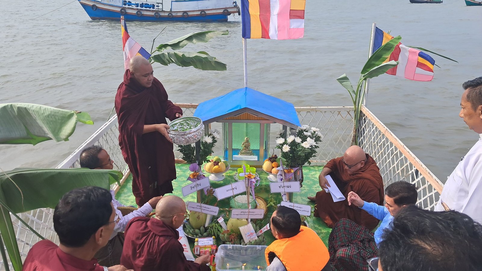 ဒါပေမယ့် စစ်တွေမြို့မှာ ဒီကနေ့ ဘေးအန္တရာယ်ကင်းရှင်းရေးပရိတ်၊ပဌာန်းရွတ်ဖတ်တာ၊ ရှင်ဥပ ဂုတ္တဖောင်တော် ပူဇော်တာတွေလုပ်တဲ့နေရာမှာတော့ စစ်ကောင်စီရဲ့ ရခိုင်ပြည်နယ်ဝန်ကြီးချုပ် ဦးထိန်လင်းကိုတွေ့ရပါတယ်။
