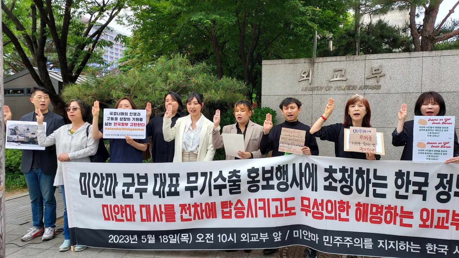 ကိုရီးယားလူမှုအဖွဲ့အစည်း(၁၀၀)ကျော်ပါဝင်တဲ့ မြန် မာ့ဒီမိုကရေစီအရေးကိုထောက်ခံတဲ့ကိုရီးယားအဖွဲ့ချုပ်က အဲ့ဒီကိစ္စကိုကန့်ကွက်ရှုတ်ချတဲ့ဆန္ဒပြပွဲနဲ့ သတင်းစာရှင်းလင်းပွဲကို ဆိုလ်းမြို့ရှိ ကိုရီးယားနိုင်ငံခြားရေး ဝန်ကြီး ဌာနရုံးရှေ့မှာဒီကနေ့ မနက်ပိုင်းက ကိုရီးယားရောက်မြန်မာနိုင်ငံသားတွေနဲ့အတူ ပြုလုပ်ခဲ့ကြတယ် လို့သိရပါ တယ်။
