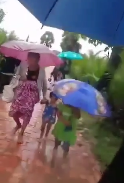 နောက်ထပ် ရုပ်သံမှတ်တမ်းတခုမှာတော့ အသက် ၈၀ ခန့်ရှိအမျိူးသမီးတဦးက “ကြောင်တွေလည်း ထမင်းငတ်ပြီ၊ ကြောင်ကြီးတကောင်လည်း ထပ်ရောက်နေသေးတယ်၊ ဘယ်ကဘယ်က ပြေးလာမှန်းလည်းမသိဘူး” လို့ ထားဝယ်စကားနဲ့ ငြီးတွား ပြောဆိုပြီး မိုးရေထဲ အခြားအဖော် ၅ ဦးနဲ့ ရွာထဲကနေ လမ်းလျှောက်ထွက်ပြေးလာတာကို တွေ့ရပါတယ်။
