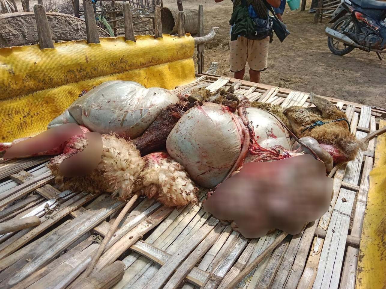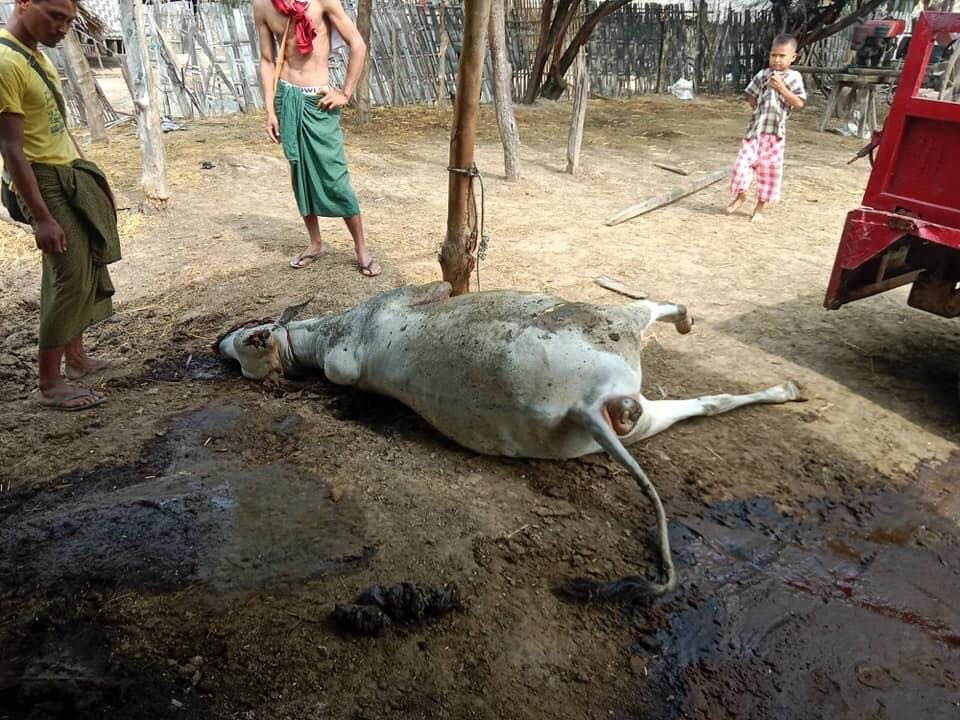” ရွာထဲမှာရှိတဲ့နွားတို့ သိုးတို့ ခုနှစ်ကောင်ကို မသေမရှင် သတ်ပစ်ထားခဲ့တယ်ပေါ့နော် ။နွားတွေရဝကောင်လောက်ကို နွားသိုးပေါ့နော် အကောင်ရေ စုစုပေါင်း ၇၀ လောက်ကို လည်း ရွှေဘိုနယ် ဖိုလ်ကုန်းပျူရွာဖက်ကို မောင်းတင်သွားတယ်ပေါ့နော်” လို့ ၎င်းကပြောပါတယ်။