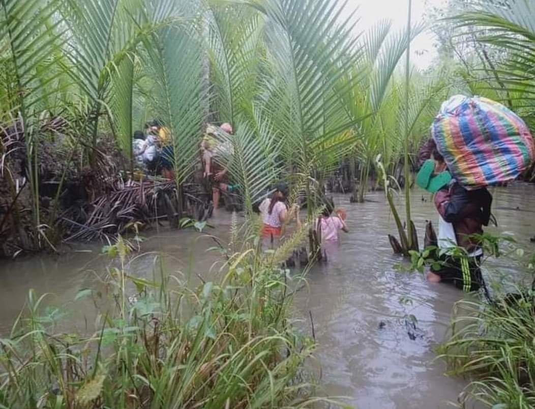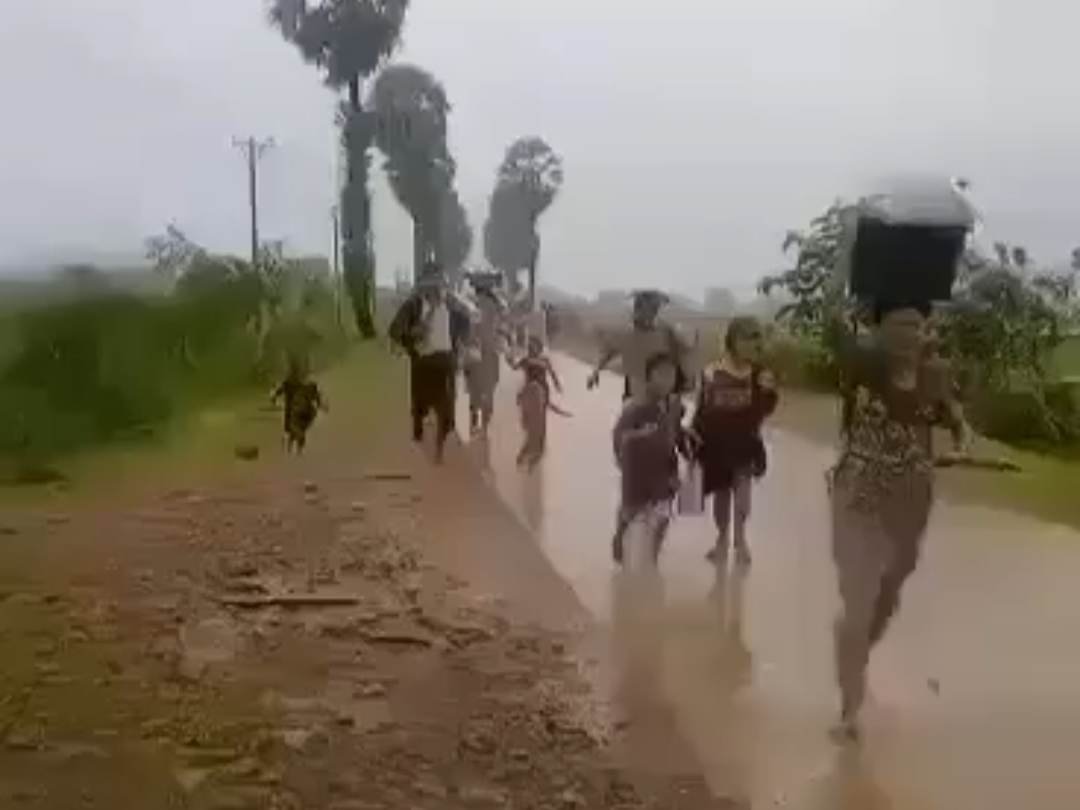 ပုံစာ-ဇွန်လ ၁၂ ရက်နေ့က မိုးရေထဲ စစ်ရှောင်နေကြရတဲ့ သရက်ချောင်းဒေသခံများ