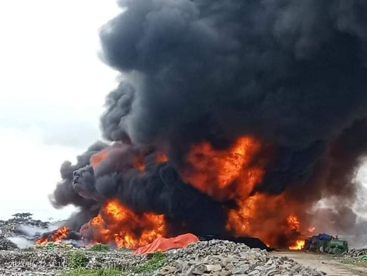 ဒီကနေ့မနက်ပိုင်းက ထိန်ပင် အမှိုက်ပုံမှာ ၂၂ဘီး ကုန်တင်ကားတစီးစာ ဓာတုစွန့်ပစ်ပစ္စည်းတွေကို မြေတူး စက်နဲ့ ကျင်းတူးပြီး လာရောက်စွန့်ပစ်မြှုပ်နှံချိန်မှာ ပေါက်ကွဲမှုဖြစ်ကာ မီးလောင်ခဲ့တာလို့ သိရပါတယ်။