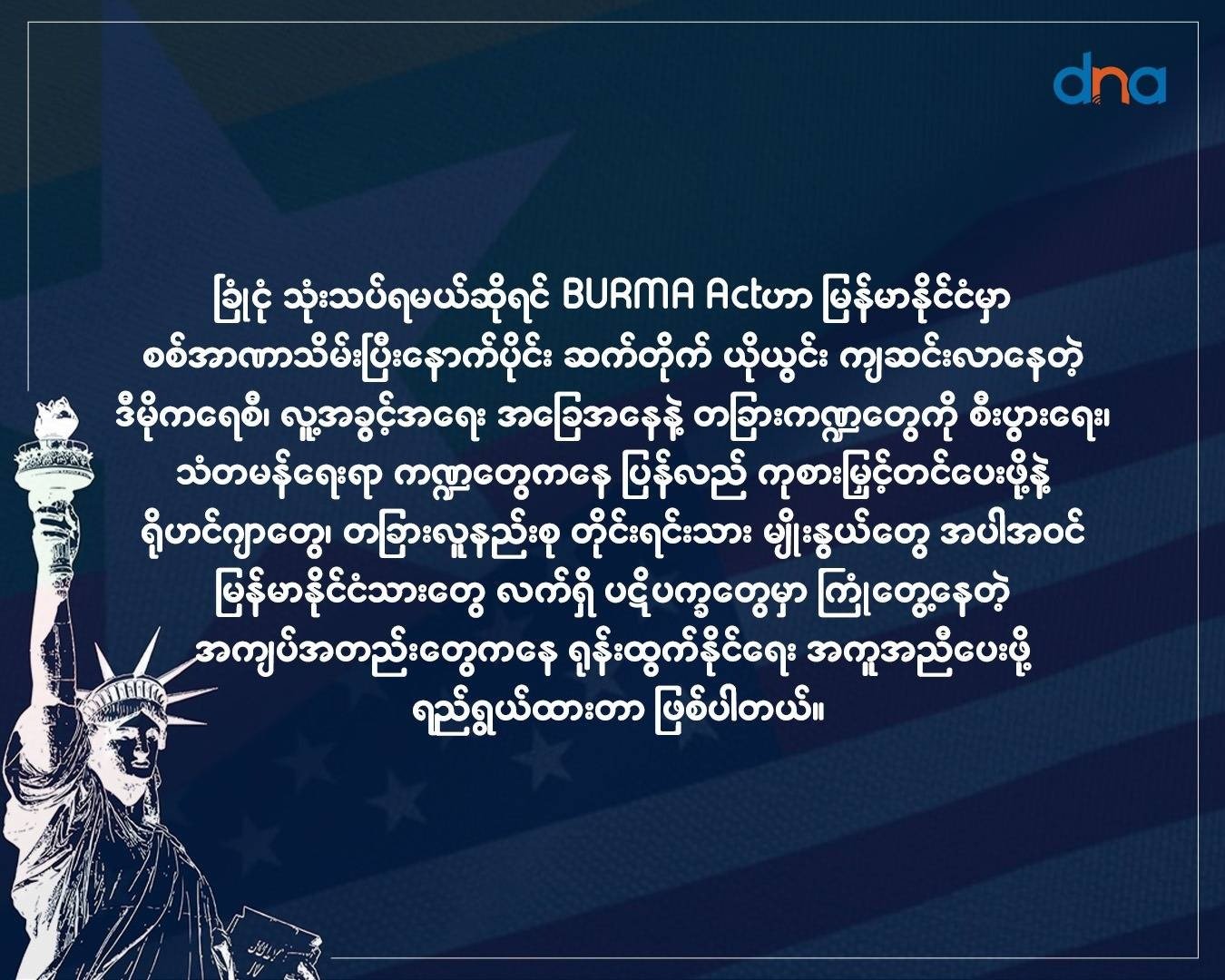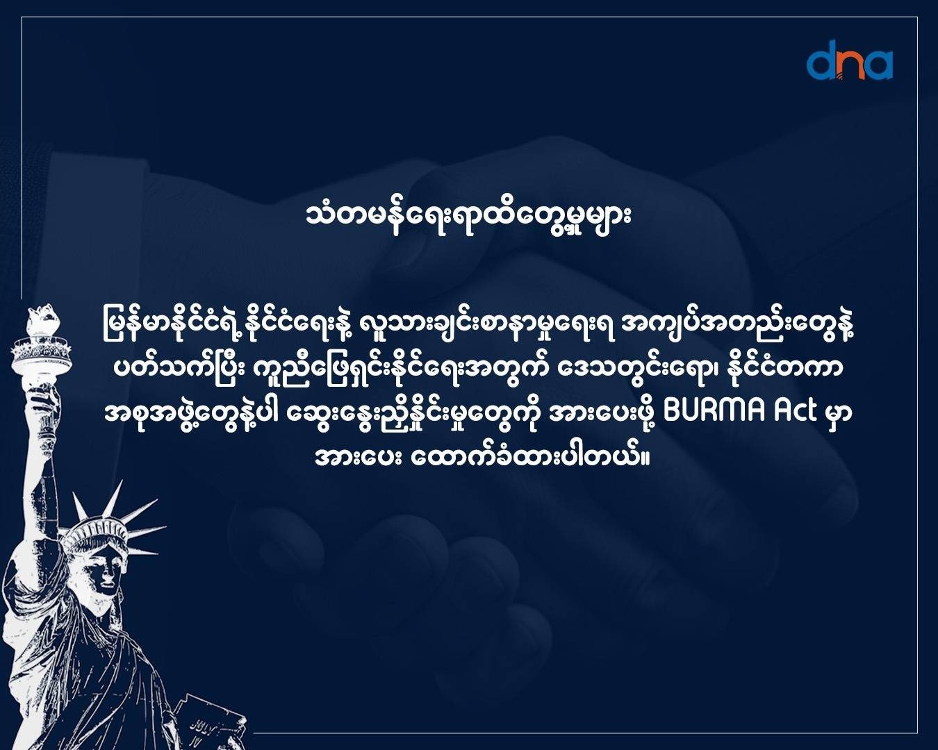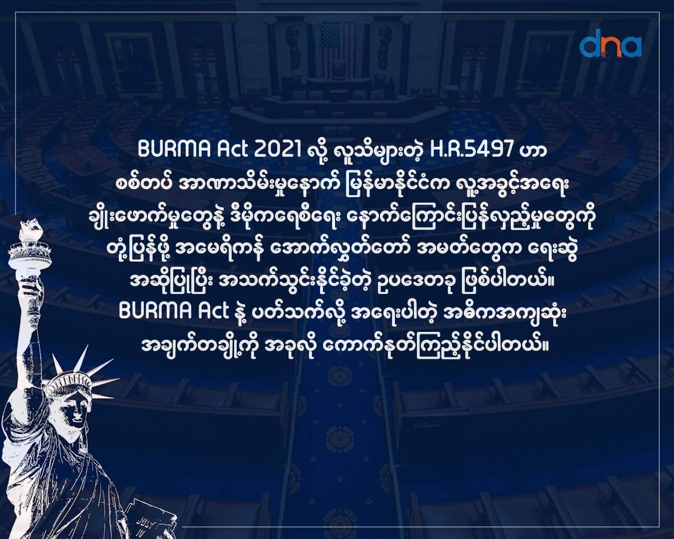 BURMA Act 2021လို့ လူသိများတဲ့ H.R.5497ဟာ စစ်တပ် အာဏာသိမ်းမှုနောက် မြန်မာနိုင်ငံက လူ့အခွင့်အရေး ချိုးဖောက်မှုတွေနဲ့ ဒီမိုကရေစီရေး နောက်ကြောင်းပြန်လှည့်မှုတွေကို တုံ့ပြန်ဖို့ အမေရိကန် အောက်လွှတ်တော် အမတ်တွေက ရေးဆွဲ အဆိုပြုပြီး အသက်သွင်းနိုင်ခဲ့တဲ့ ဥပဒေတခု ဖြစ်ပါတယ်။ BURMA Actနဲ့ ပတ်သက်လို့ အရေးပါတဲ့ အဓိက အကျဆုံး အချက်တချို့ကို အခုလို ကောက်နုတ်ကြည့်နိုင်ပါတယ်။