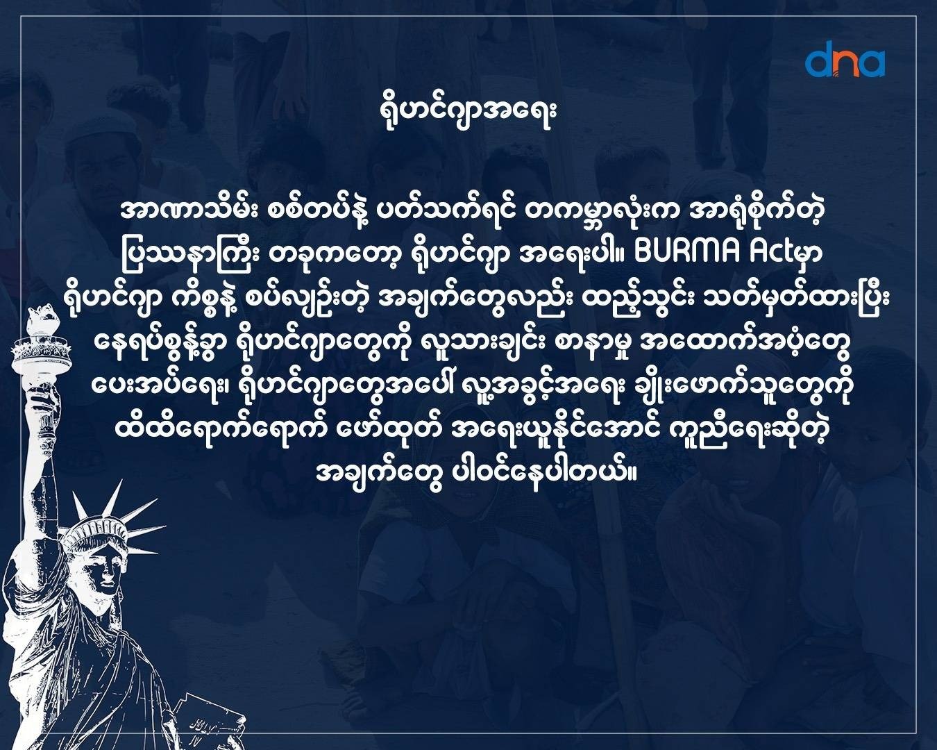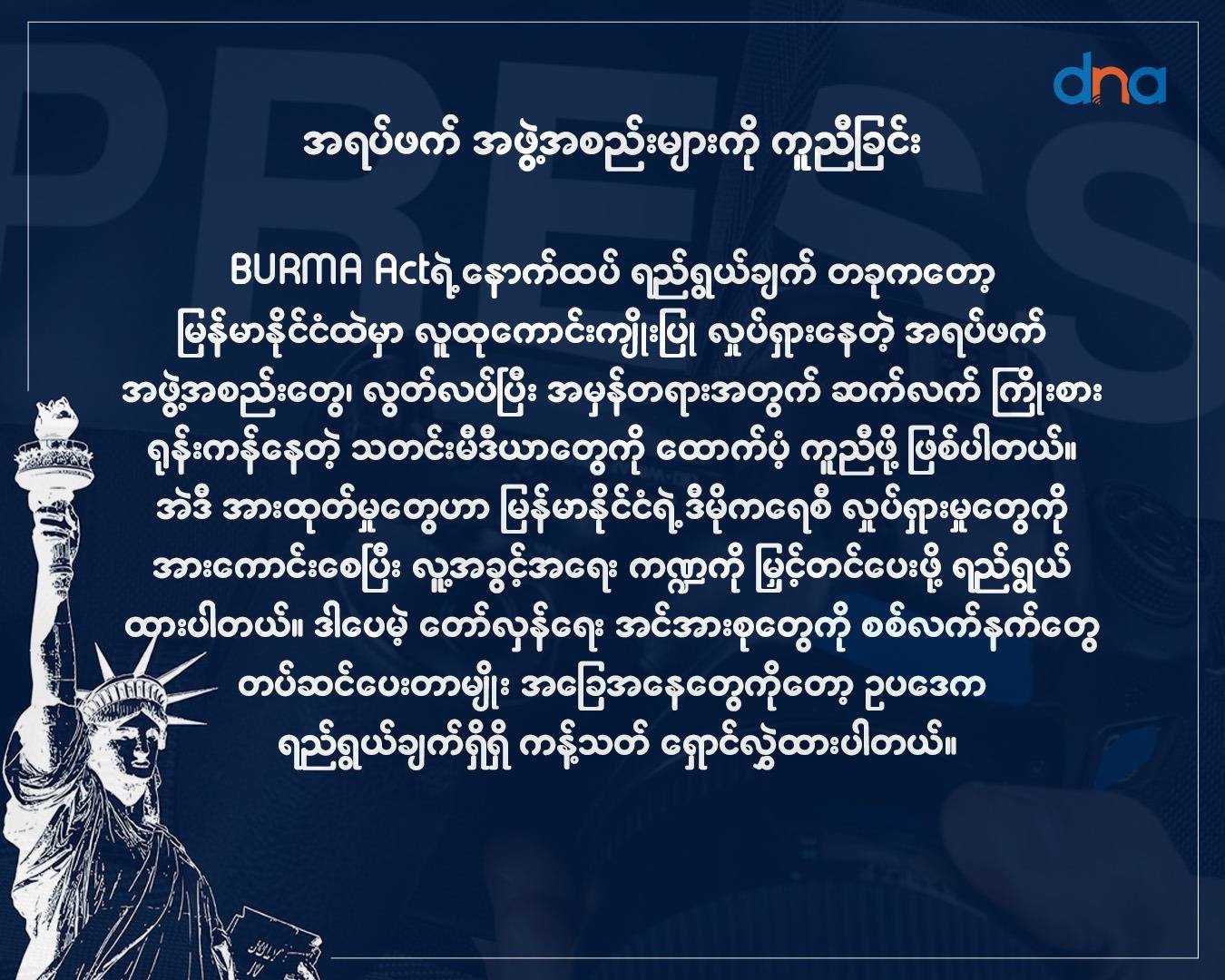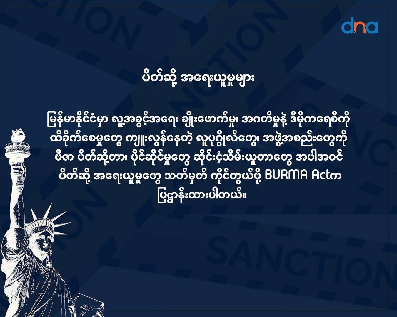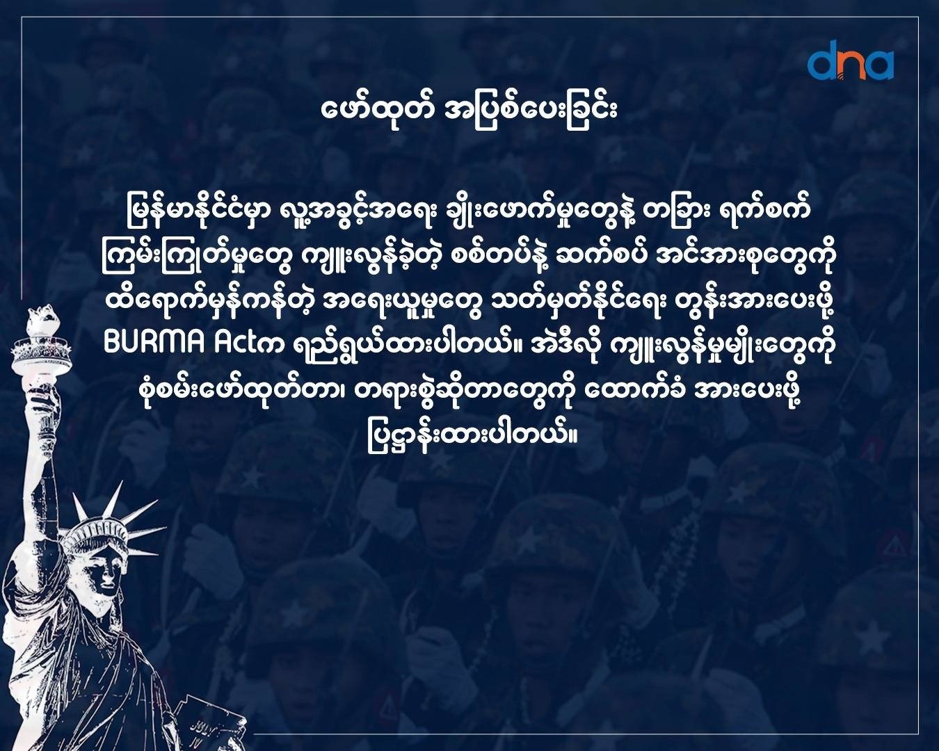 BURMA Act 2021လို့ လူသိများတဲ့ H.R.5497ဟာ စစ်တပ် အာဏာသိမ်းမှုနောက် မြန်မာနိုင်ငံက လူ့အခွင့်အရေး ချိုးဖောက်မှုတွေနဲ့ ဒီမိုကရေစီရေး နောက်ကြောင်းပြန်လှည့်မှုတွေကို တုံ့ပြန်ဖို့ အမေရိကန် အောက်လွှတ်တော် အမတ်တွေက ရေးဆွဲ အဆိုပြုပြီး အသက်သွင်းနိုင်ခဲ့တဲ့ ဥပဒေတခု ဖြစ်ပါတယ်။ BURMA Actနဲ့ ပတ်သက်လို့ အရေးပါတဲ့ အဓိက အကျဆုံး အချက်တချို့ကို အခုလို ကောက်နုတ်ကြည့်နိုင်ပါတယ်။