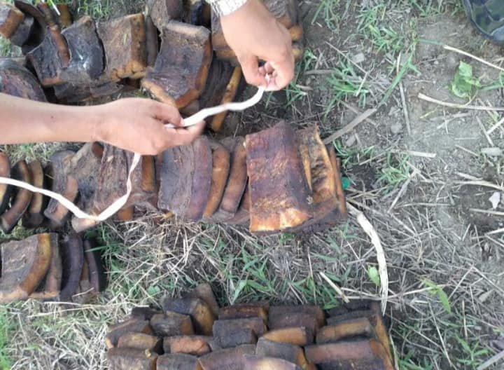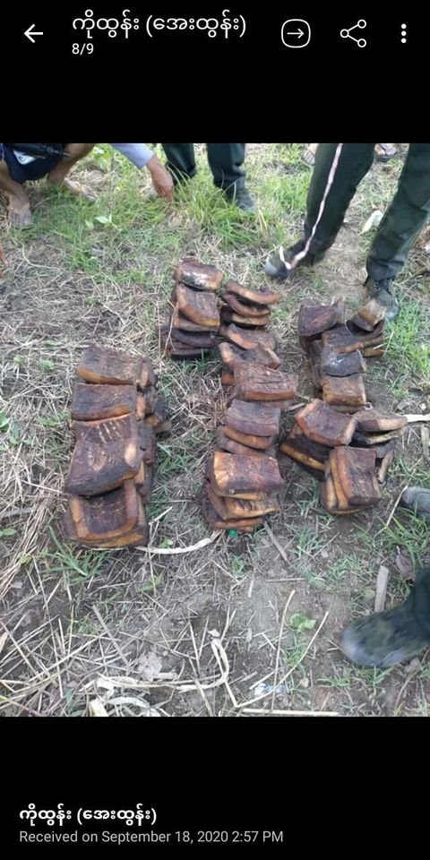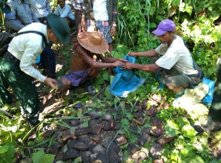 အကွက်အမှတ်(၅၀)အတွင်း ဒေသအခေါ် ခွေးပိချောင်းအနီးတောစပ်မှာ အလျား ၅လက်မ အနံ ၃လက်မခန့်ရှိတဲ့ ဆင်သားရေအခြောက် စုစုပေါင်း ၁၀၉ခုကို ပိုင်ရှင်မဲ့ သိမ်းဆည်းရမိခဲ့တယ်လို့ တိုင်းဒေသကြီးရဲတပ်ဖွဲ့မှူးရုံးက တာဝန်ရှိရဲအရာရှိတစ်ဦးက ပြောပါတယ်။