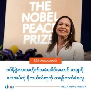 ဗင်နီဇွဲလား အတိုက်အခံခေါင်းဆောင် မာရီယာ ကိုရီနာ မာချာဒိုဟာ ဇန်နဝါရီလ ၁၅ရက်နေ့က အိမ်ဖြူတော်မှာ သမ္မတ ဒေါ်နယ်ထရမ့်နဲ့တွေ့ဆုံစဉ်အတွင်း သူ ရရှိထားတဲ့ နိုဘယ်ငြိမ်းချမ်းရေးဆု တံဆိပ်ကို သမ္မတထရမ့်ထံ ပေးအပ်ခဲ့ပါတယ်။