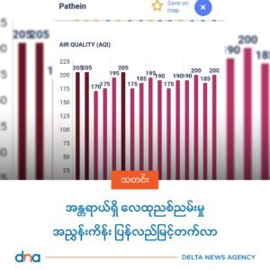 ဧရာဝတီတိုင်းထဲမှာ လေထုညစ်ညမ်းမှု အညွှန်းကိန်းတွေဟာ ဒီကနေ့ကစလို့ ထပ်မံမြင့်တက်လာနေပြီး ယခု ၃ ရက်အတွင်း ကျန်းမာရေးအတွက် အန္တရာယ်ရှိ အဆင့်ကိုရောက်ရှိနေမှာဖြစ်တာကြောင့် ဒေသခံတွေအနေနဲ့ ဂရုစိုက်နေထိုင်ကြဖို့လိုပါတယ်။