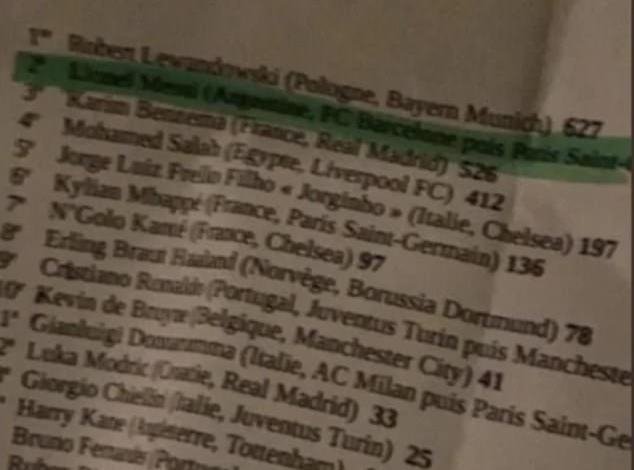 ပေါက်ထွက်လာခဲ့တဲ့စာရင်းမှာ လီဝန်ဒေါစကီးက ထိပ်ဆုံးမှာ ရ့ပ်တည်နေပြီး မက်ဆီကတော့ ဒုတိယနေရာမှာ ရပ်တည်နေခဲ့တာပါ။ နောက်မှာတော့ ဘန်ဇီးမားနဲ့ ဆာလားတို့က ဆက်တိုက်ရပ်တည်နေခဲ့ပါတယ်။